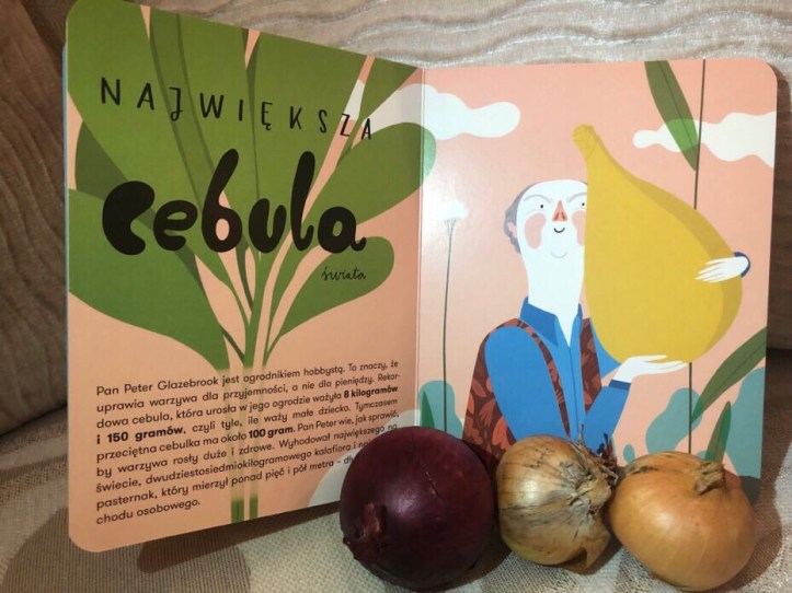 Pokrótce opowiem Wam o najciekawszych rekordach zgromadzonych w książeczce. Dorośli, by znaleźć się w tej księdze, robią dziwne rzeczy. Znajdziemy tutaj największą na świecie wyhodowaną cebulę ważącą aż 8kg i 150g; najwyższego człowieka świata, którego wzrost wynosi 2m i 51cm; największą kulę zrobioną z gum do żucia.