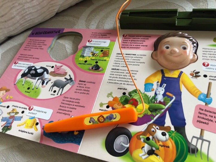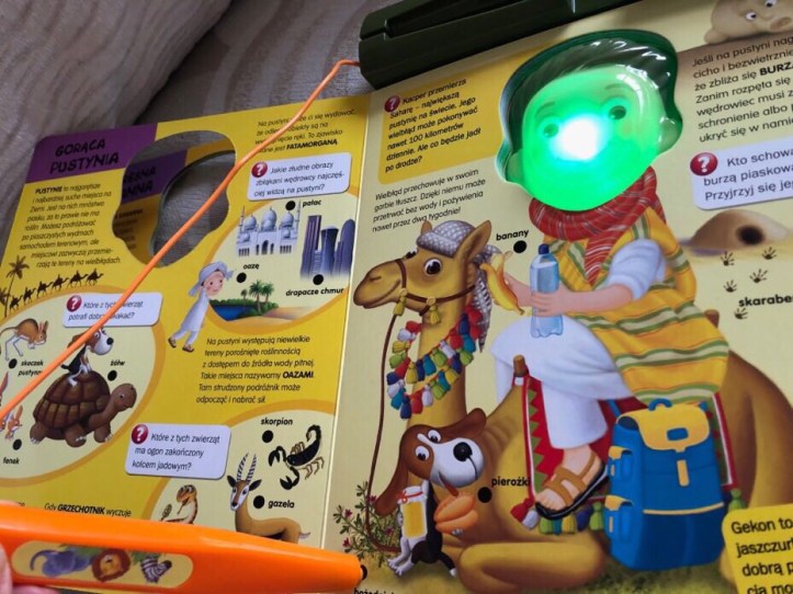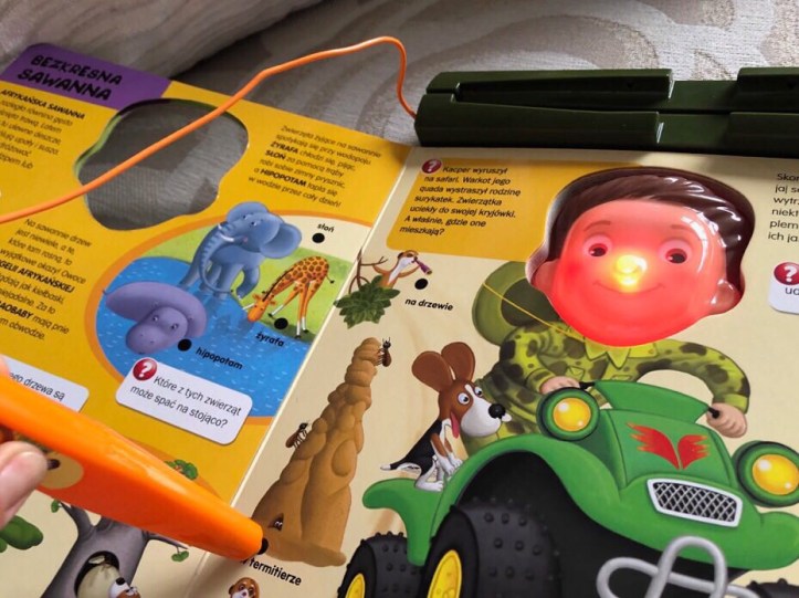 Na stronicach znajdziemy mnóstwo pytań, a załączony dźwiękowy długopis sprawdzi czy odpowiedź jest prawidłowa. Jeśli tak, słyszymy dźwięk i twarz chłopca świeci się na zielono, jeśli odpowiedź jest zła twarz chłopca jest czerwona, a my słyszymy specyficzny brzdęk sygnalizujący złą odpowiedź.