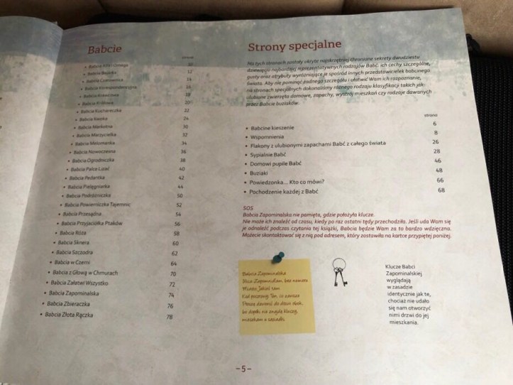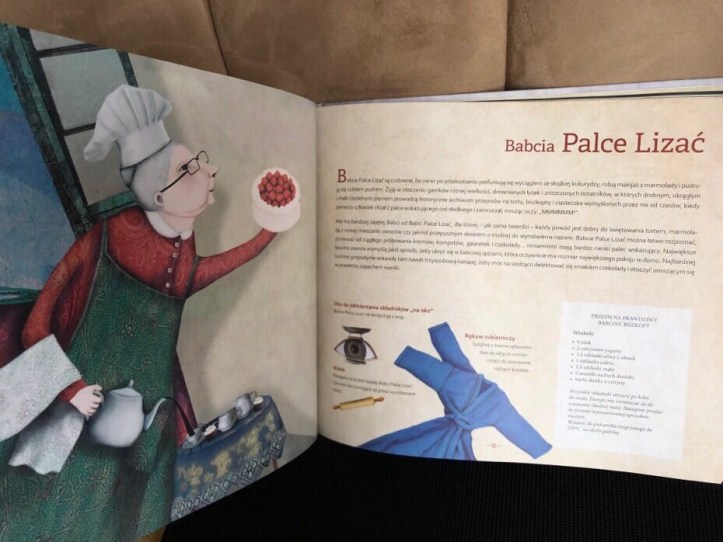 Oprócz stron poświęconych opisom kolejnych typów babć, znajdziecie w książce także strony specjalne, a na nich: zawartość babcinych kieszeni, domowi pupile babć, flakony z ukochanymi zapachami, rodzaje sypialni czy buziaków. Niesamowite, jak dużo w tym prawd znanych każdemu z życia.