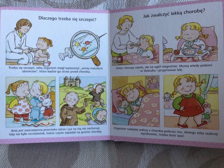 Dowiemy się: po co są szczepienia, jak należy się myć, co zrobić gdy się skaleczymy lub dlaczego trzeba brać syrop, gdy jest się chorym.
