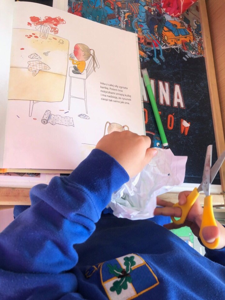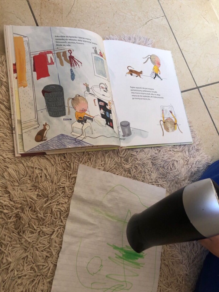 Niestety niesforny kot rozlewa wodę z wazonu na pracę Inki. Czerwieniejąca ze złości dziewczynka pędem biegnie do łazienki, gdzie suszarką do włosów suszy rysunek, aby go odratować. Niestety suszarka marszczy papier i z naprawdę obiecującej pracy robi się okropny obrazek. Inka przepełniona złością zgniata kartkę papieru, po czym tnie ją ostrymi nożyczkami i wyrzuca!