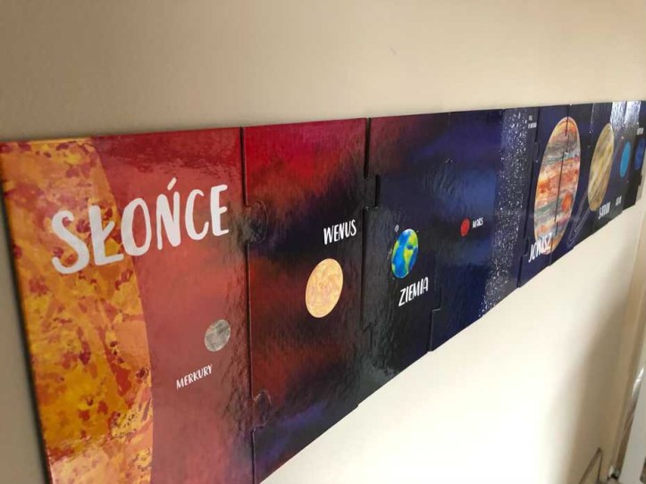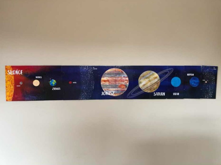 Po złożeniu dwunastu elementów kosmicznej układanki uzyskamy obraz dwunastu planet o wymiarach 136×22cm (całość). Naszym oczom ukazują się: Słońce, Merkury, Wenus, Ziemia, Mars, Pas Planetoid, Jowisz, Saturn, Uran, Neptun oraz planeta karłowata Pluton. Taki typ zabawy to jeden z najbardziej efektywnych sposobów na rozwijanie umysłu u dziecka, czyli tak zwane przyjemne z pożytecznym. Kształtuje on umiejętności logicznego myślenia, ma duży wpływ na czytanie ze zrozumieniem i uczy cierpliwości.