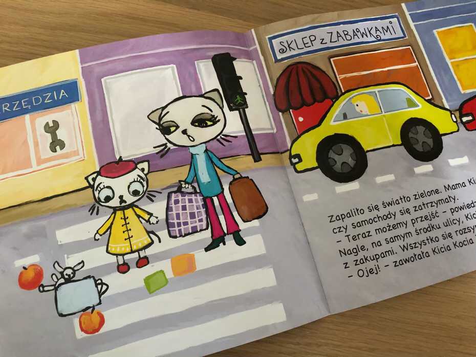 Na szczęście akurat zjawia się pan policjant i oferuje pomoc. Zatrzymuje samochody i pozwala Kici Koci i jej mamie spokojniej pozbierać rozsypane przedmioty. Małej bohaterce zaimponowało to, że wszyscy muszą się go słuchać i sama zapragnęła zostać policjantką. Nie omieszkała podpytać stróża prawa czy kiedykolwiek złapał złodzieja. Okazało się, że tak, co poskutkowało narodzinami nowego pomysłu na nową, kreatywną rozrywkę Kici Koci z przyjaciółmi. Zabawa w złodziei i policjantów umila dzieciom resztę dnia.