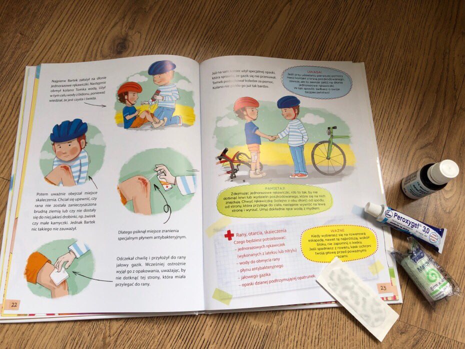 „Pierwsza pomoc. Książka na wszelki wypadek” to proste i bardzo przyjemne kompendium wiedzy dla dzieci. Najmłodsi dowiedzą się jak szybko reagować oraz czego absolutnie nie robić. Poznamy tu najważniejszy numer telefoniczny, jaki należy wybrać, gdy potrzebna jest pomoc lekarza.