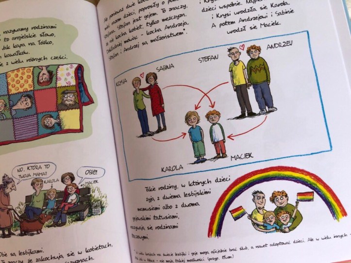 W książce znajdziemy przykłady i zwięzłe opisy rodzin: samotnej matki z dzieckiem, po rozwodzie, patchworkowej, zastępczej, ojca z córką i jej macochą oraz tęczowej. Dowiemy się na czym polega opieka naprzemienna, np. dlaczego w niektórych rodzinach przez tydzień dziecko mieszka z mamą, a na weekend wyjeżdża do taty.