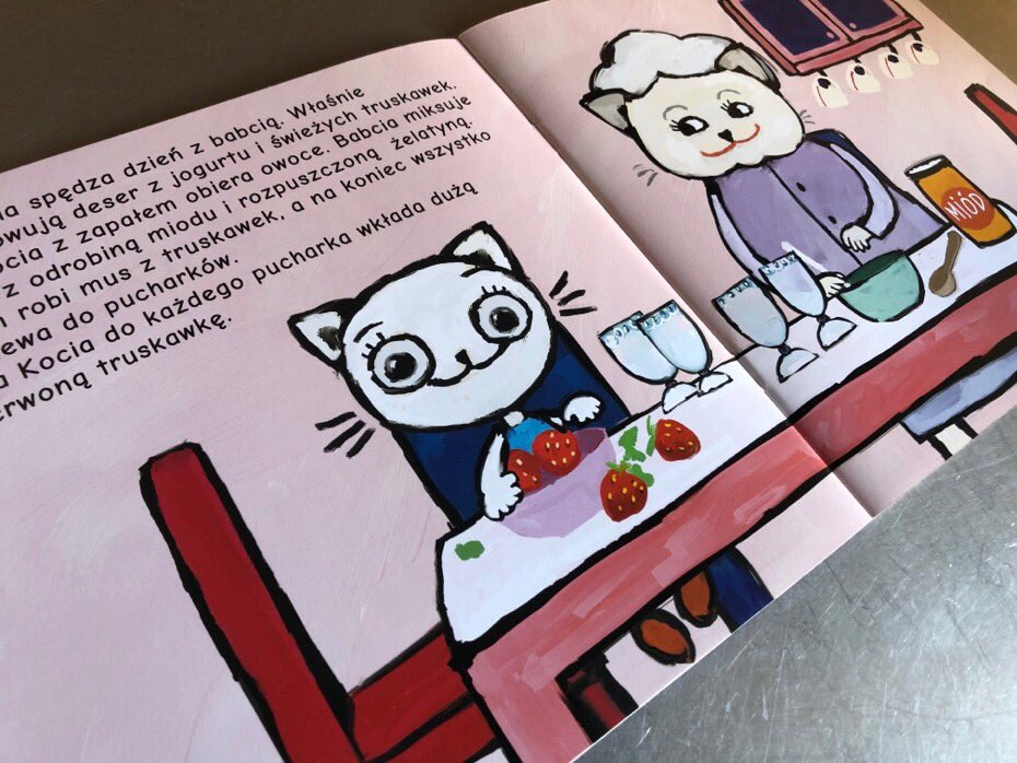 Kicia Kocia z babcią przygotowują deser truskawkowy. Po wykonanych pracach w kuchni nadszedł czas na sprzątanie. Kicia Kocia wyrzuca listki z obranych truskawek do kubełka. Kubeczek po jogurcie trafia natomiast do pojemnika na plastik. Szykując się do wyjścia zabierają ze sobą bawełnianą torbę oraz przeterminowane lekarstwa do utylizacji. Dzieci dowiedzą się z książeczki, że stare i niepotrzebne leki również wyrzuca się do specjalnych pojemników, znajdujących się w aptekach.
