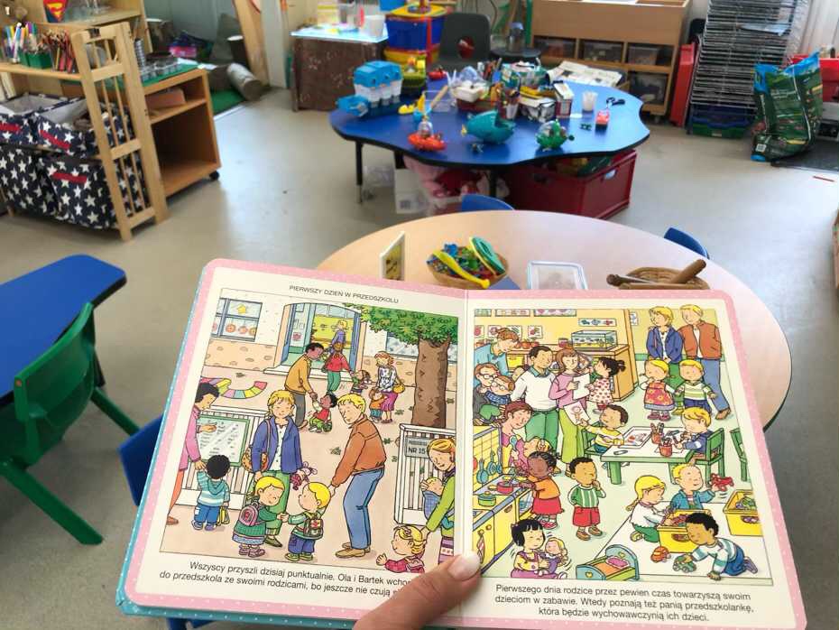 Jasno zobrazowany jest pierwszy dzień w przedszkolu. Dla nowo przybyłych dzieci czas do zaadoptowania się upływa z rodzicami, ale po jakimś czasie mama i tata opuszczają placówkę i pozostawiają dzieci pod opieka pani prowadzącej.