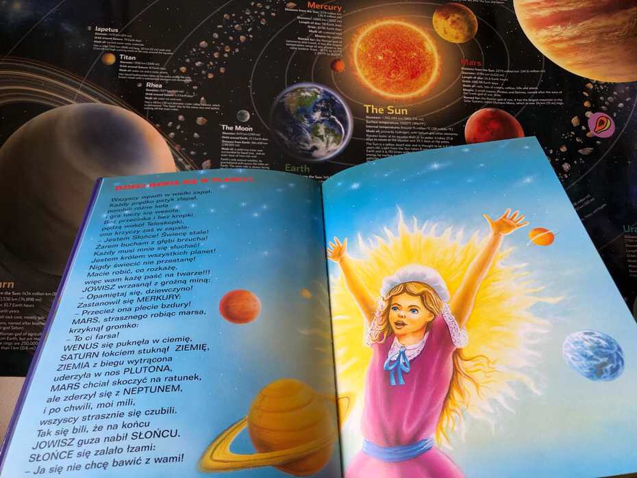 Tata opowiedział dzieciom o planetach, które krążą wokół słońca, a więc o Ziemi, Marsie, Jowiszu, Merkurym, Plutonie, Wenus, Saturnie, Uranie i Neptunie. Pan Astronom poszerza wiedzę swoich dzieci mówić o też o tym, że inne planety mają swoje księżyce, np. Uran ma ich 15, Saturn aż 28.