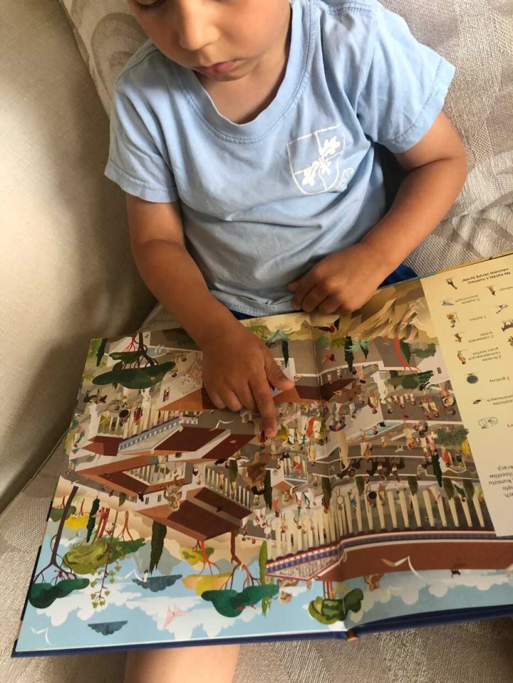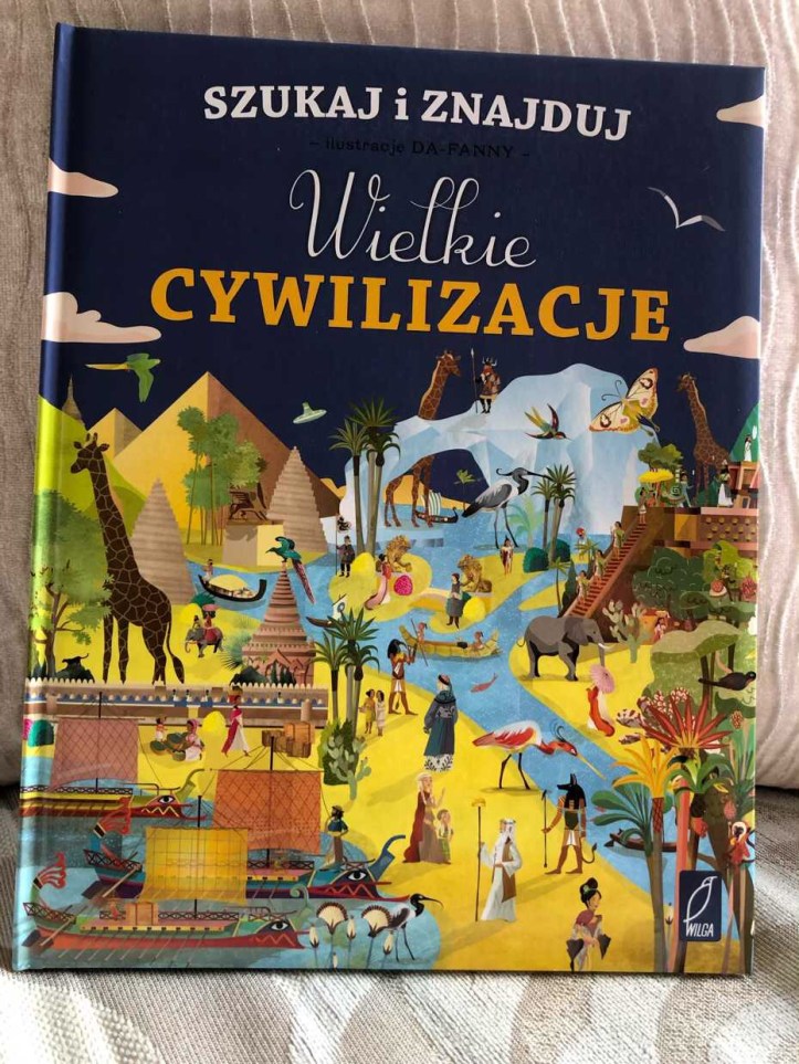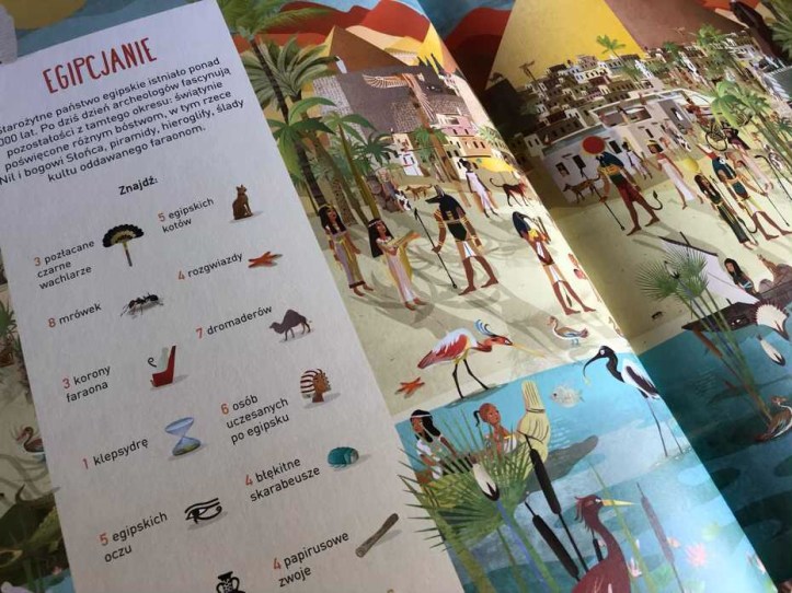 W środku książki znajdziemy 9 szczegółowych plansz, na których najmłodsi będą wyszukiwali konkretne elementy. Jest to wspaniała gratka dla dzieci, które interesują się historią. Na rozkładówce, po lewej stronie mamy krótki opis danej kultury, a na sąsiadującej kartce, barwnie przedstawione postacie i budowle. Mamy tu dosyć typowe zadania, polegające na odnalezieniu osób i przedmiotów.
