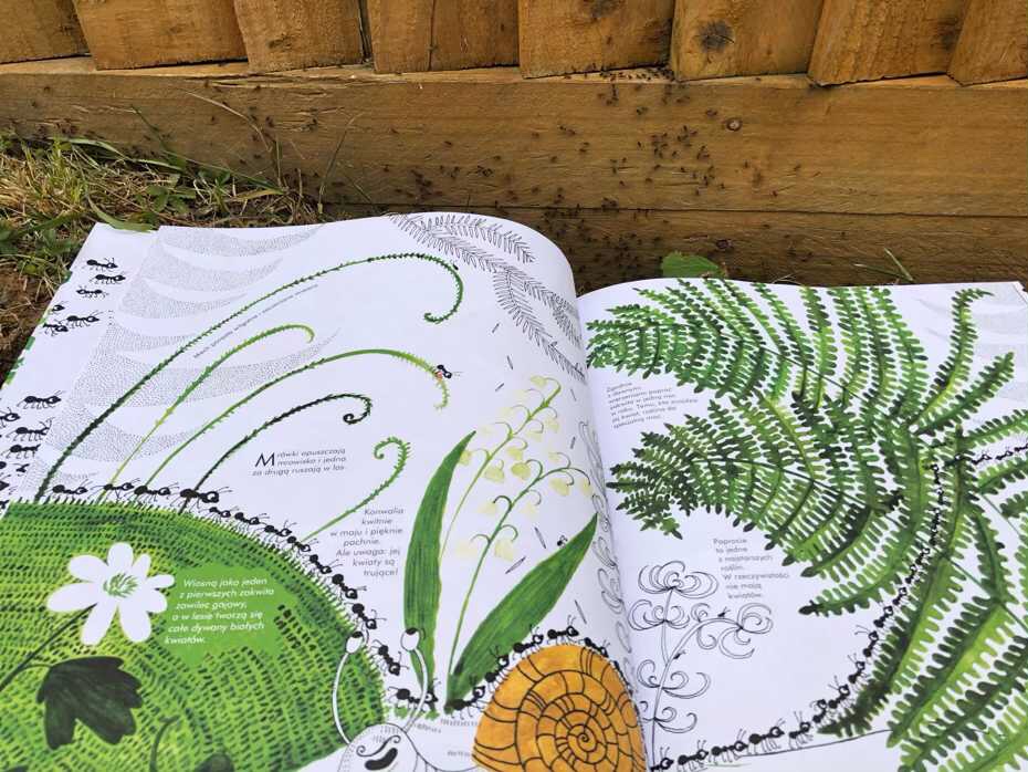 Książka pokaże nam rośliny rosnące w lesie, zwierzęta i wiele innych leśnych elementów. Razem z mrówkami maszerujemy po mchu, paproci i grzybach. Spoglądamy na komary, konika polnego i żaby.