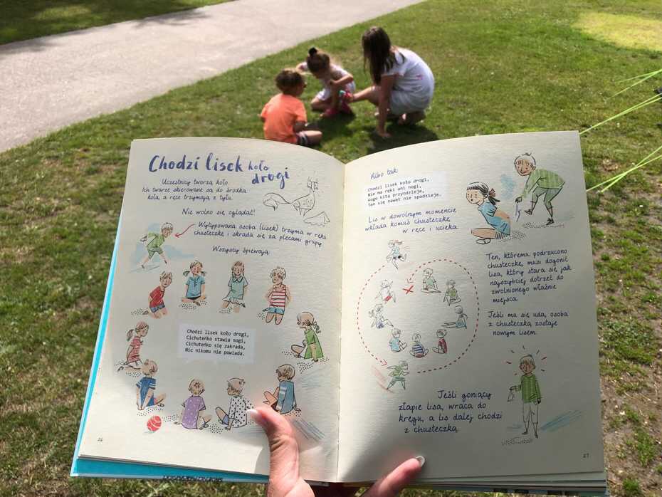 W poradniku znajdziemy zarówno zabawy podwórkowe, jak i te, w które można się bawić w domowym zaciszu. Książka została podzielona na kilka rozdziałów tematycznych np. gry z piłką, w kole czy też rozrywka na niepogodę. Wybór zabaw jest tutaj bardzo różnorodny i szeroki, więc każdy, niezależnie od gustu czy wieku znajdzie pośród tych propozycji swoją ulubioną. Wszelakie gry i zabawy wymagają od dziecka sprawności fizycznej, ale również ćwiczą pamięć, koncentrację czy cierpliwość.