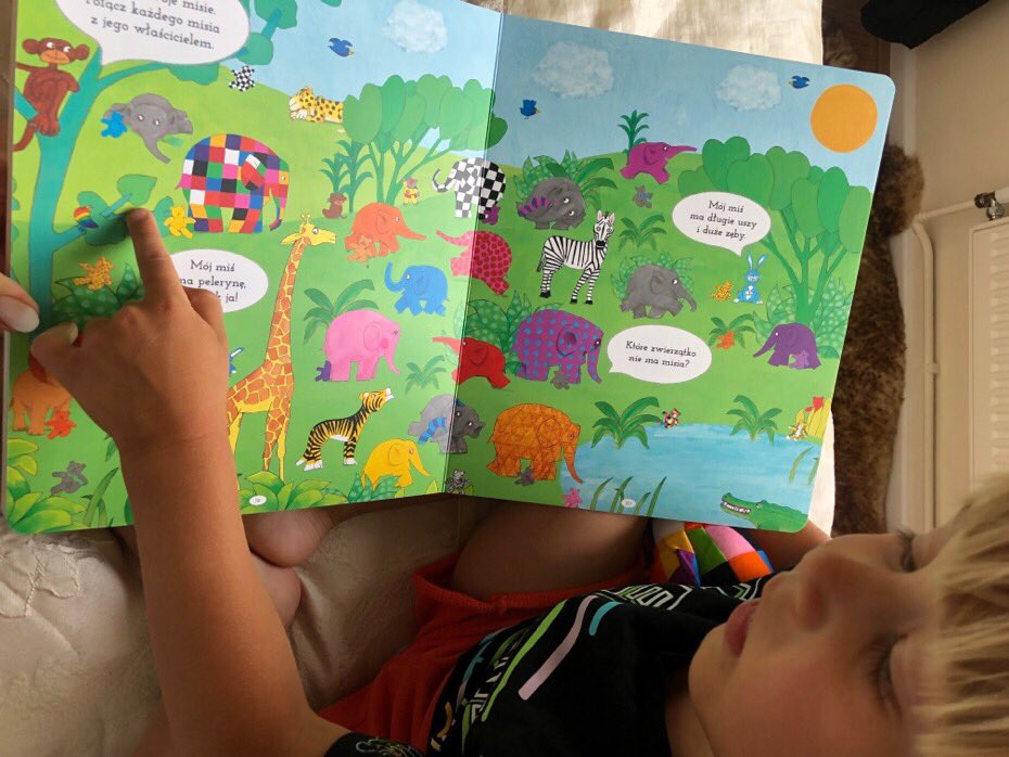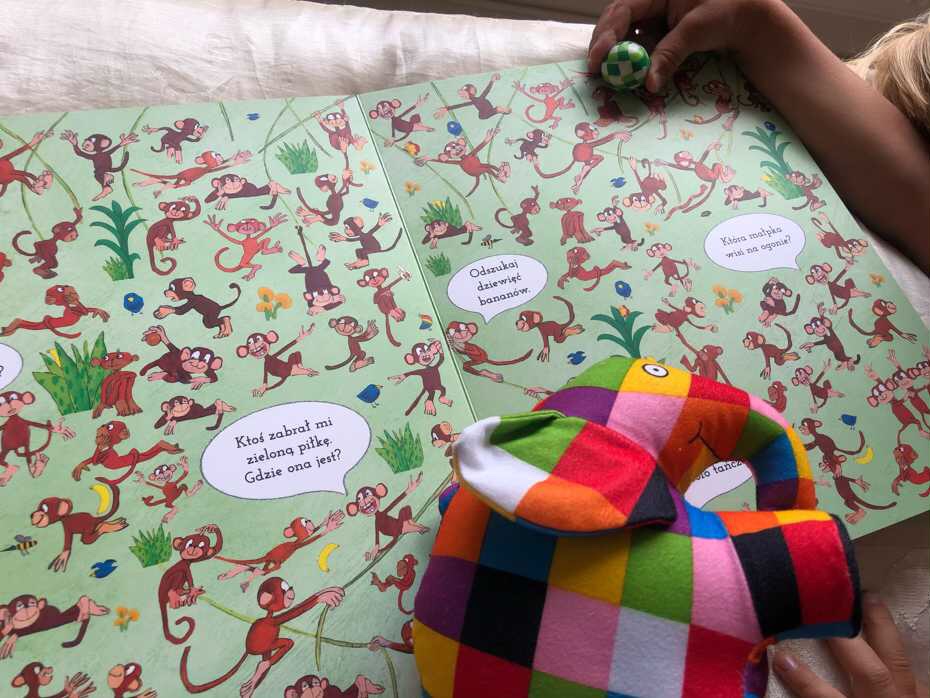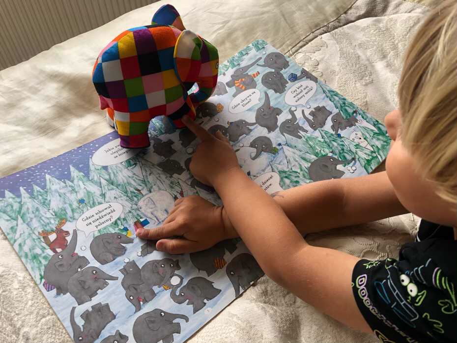 Mali czytelnicy mogą tu bez końca szukać szczegółów, wracając do nich i odnajdując kolejne ukryte elementy. Poszczególne rozkładówki mają różne stopnie trudności. Gęsto upchane na stronach zwierzęta różnią się między sobą drobnymi detalami, dlatego odnalezienie tych właściwych, wymienionych w poleceniu, jest nie lada wyzwaniem. Taka zabawa doskonale rozwija spostrzegawczość i umiejętność skupienia, pomaga w nauce liczenia oraz w poznawaniu nowych wyrazów. Fani Elmera będą się świetnie bawić i spędzą miło czas ze swoim ulubieńcem.