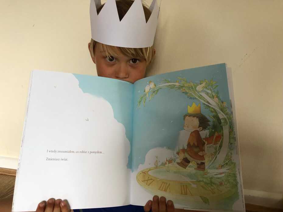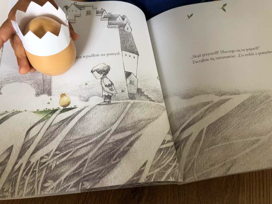 Na pierwszej stronie widzimy jajko z koroną i chłopca. To jajo symbolizuje pomysł, który jest jeszcze mały i kruchy. Natomiast lśniąca korona podkreśla jego wielką wartość. Pomysł zrodził się w głowie chłopca i od tej chwili nie odstępuje go na krok. Chłopiec nie do końca wie, co tak naprawdę ma z nim zrobić. Sądzi, że to, co wymyślił, jest nic nie warte, wiec postanawia go pozostać za sobą.