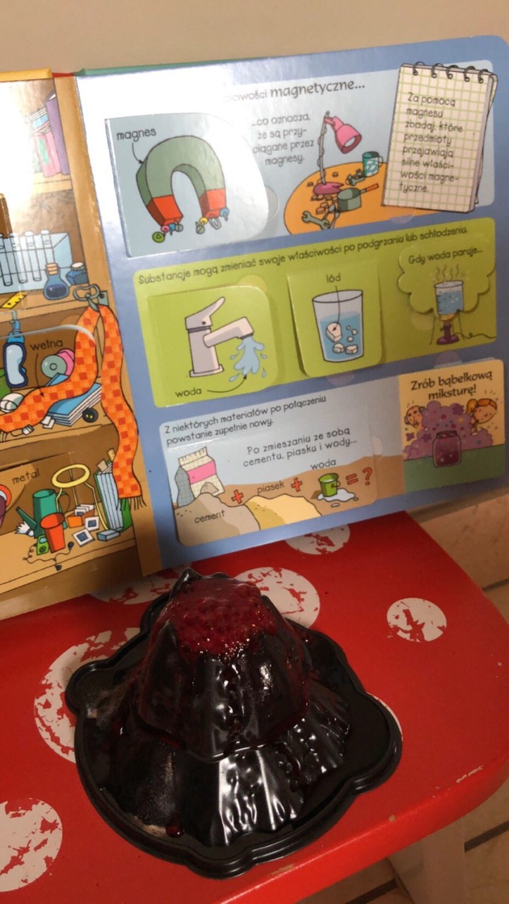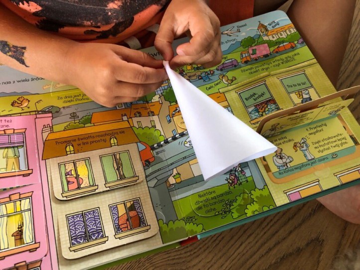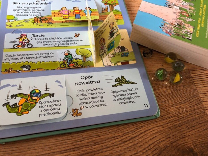 Ta solidna książeczka posiada masę okienek, w tym niektóre, otwierające się podwójnie. W środku znajdziemy kilka eksperymentów, jak choćby masę bąbelkową, jak zasadzić własny bób, zbudować megafon czy zmniejszyć siłę tarcia.