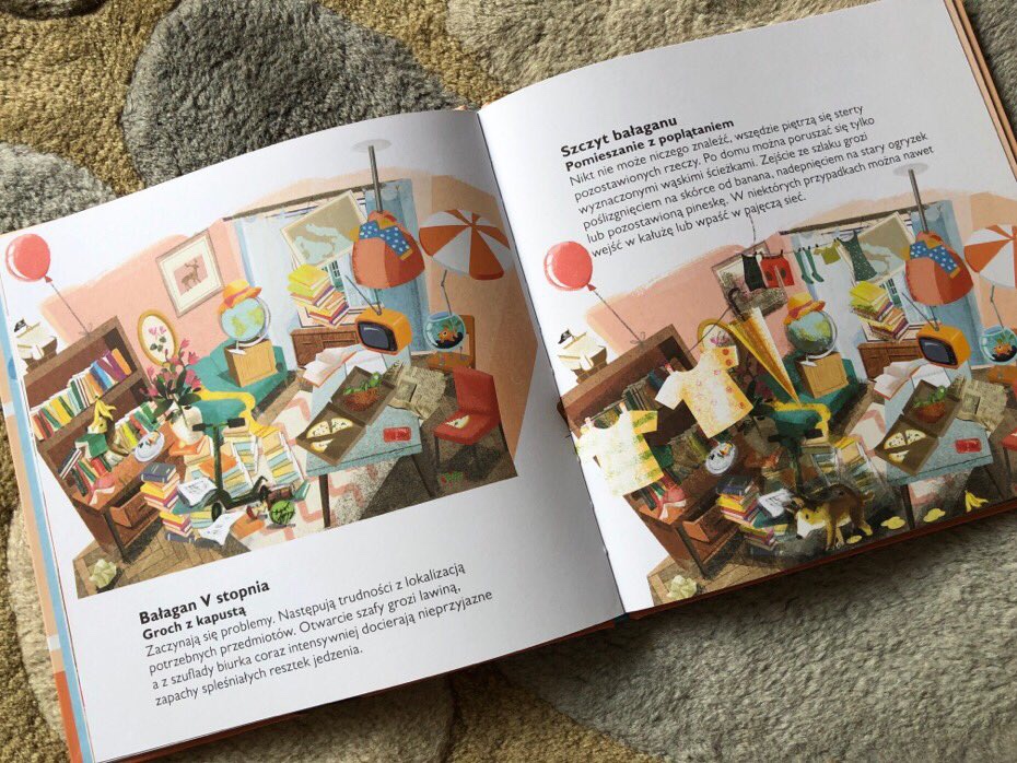 Rodzina Bałaganiaków mieszka w wielkim rozgardiaszu. Książka pokazuje nam, na przykładzie tego samego pokoju, jak wyglądają różne stopnie bałaganu. To daje nam dobrą skalę porównawczą, żeby ocenić, jak bardzo duży nieład panuje w opisywanym domu.