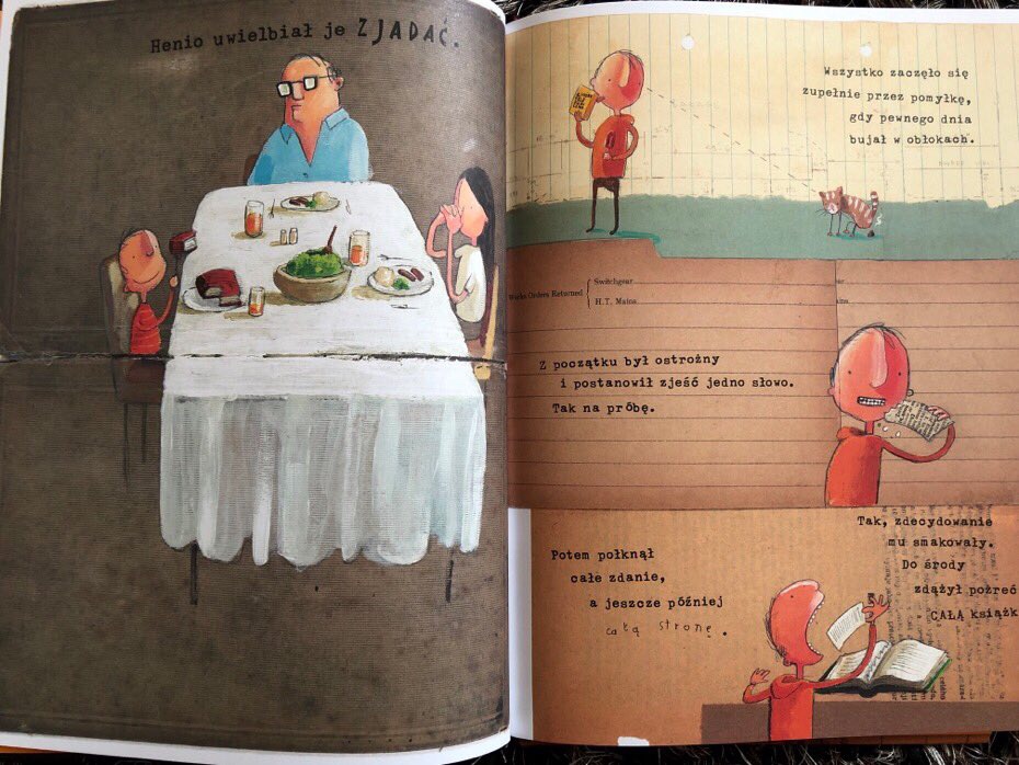 Henio uwielbiał książki, ale nie lubił ich czytać, tylko je konsumować. Jego historia zaczęła się pewnego dnia, kiedy bujał w obłokach. Zaczął od jednego słowa, potem połknął całe zdanie, aż potrafił spożyć całą książkę za jednym zamachem.
