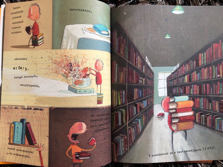 Chłopiec pożera je wszystkie. Nie ma dla niego znaczenia, jaki jest ich gatunek, ponieważ wcina każde książki, począwszy od słowników, atlasów, ksiąg, dowcipów, encyklopedii, aż po matematyczne poradniki.