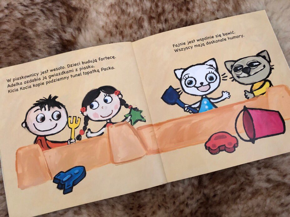 Kiedy Kicia Kocia zaprasza dzieci do wspólnej zabawy jej foremkami i wiaderkiem, wszyscy biegną razem do piaskownicy. Teraz mają doskonałe humory.
