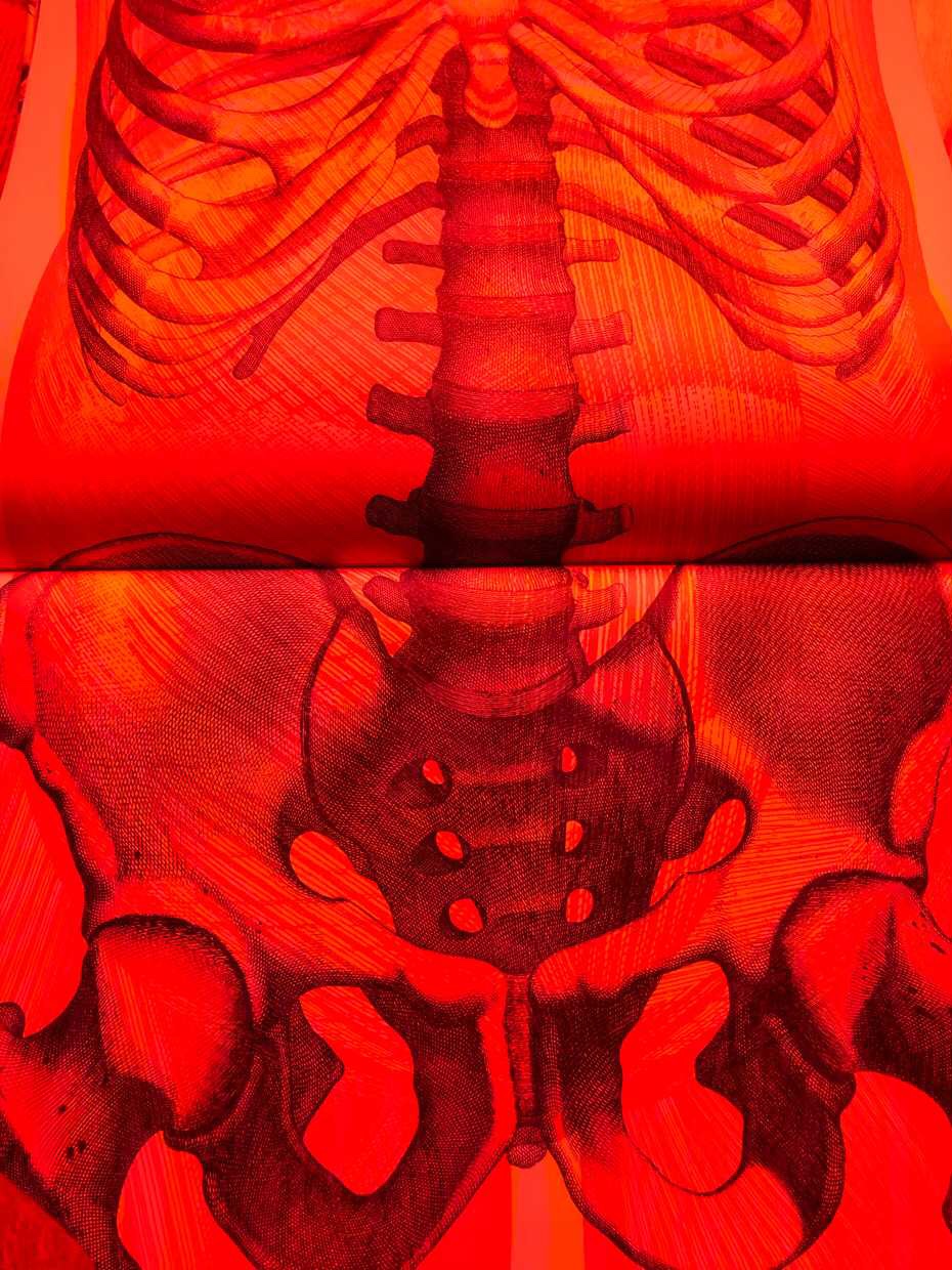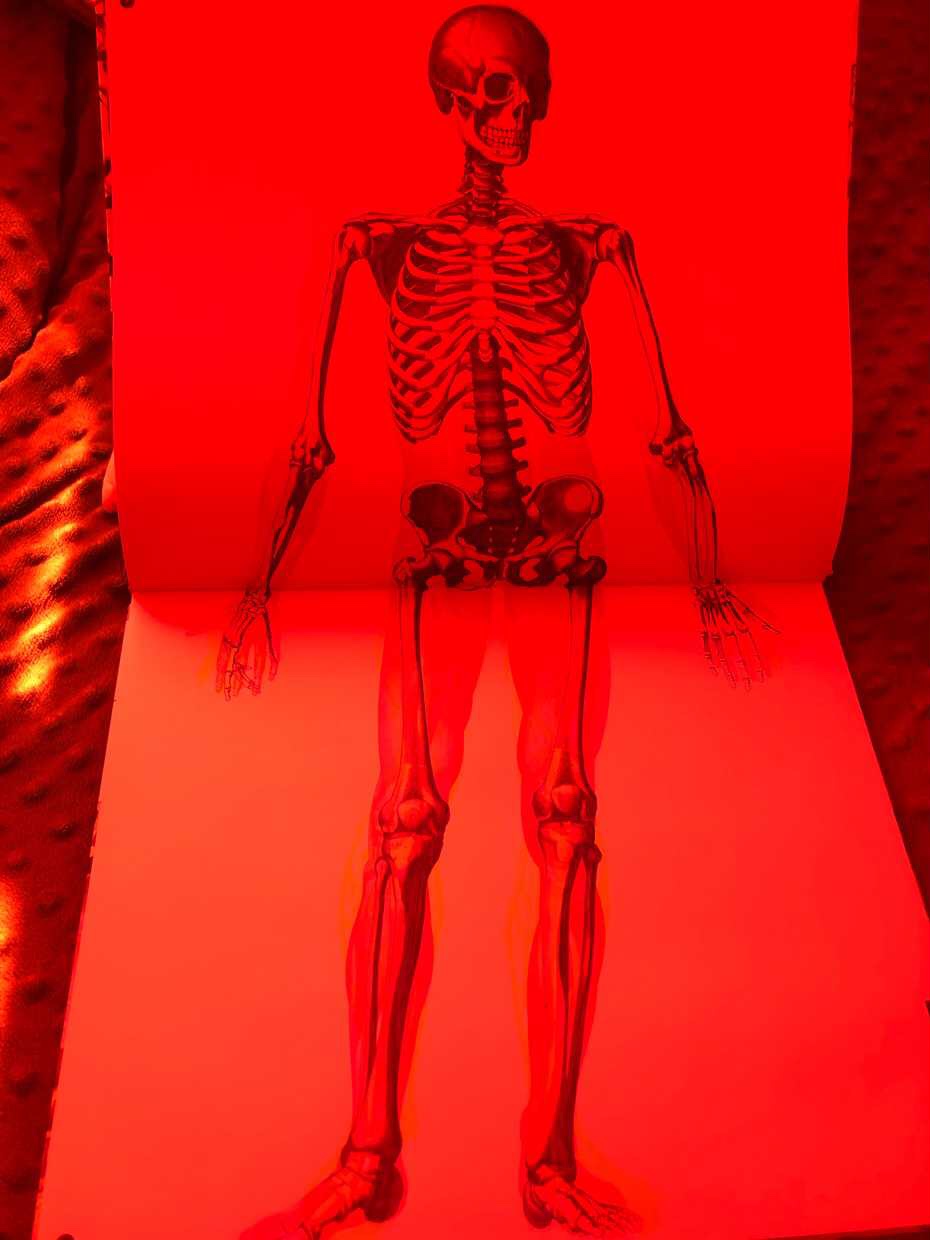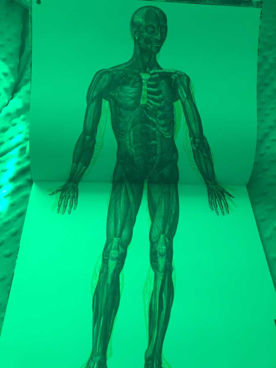 Patrząc przez czerwony czytnik soczewki, odkrywamy szkielet ciała, zielona soczewka odkrywa mięśnie, a niebieska pokazuje narządy i naczynia krwionośne. Zauważyłam, że używając niebieskiej soczewki, obrazy są dość ciemne. Trzeba mocno wytężyć wzrok, aby coś dostrzec.