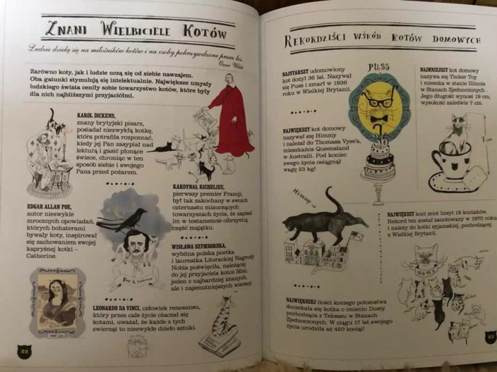Mamy też trochę historii kotów, poznajemy ich ród i anatomię. Znajdziemy też co nieco o ich indywidualizmie, mowie ciała i dobroczynnych skutkach kocioterapii. Przeczytamy również o kocich rekordach, przesądach i przysłowiach.