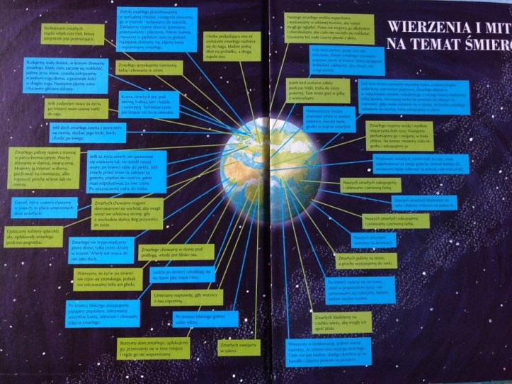 Na początku jak i na końcu młody czytelnik zapoznaje się z wierzeniami i mitami na temat śmierci z całego świata. Jak dla mnie niektóre z nich są dość szokujące.