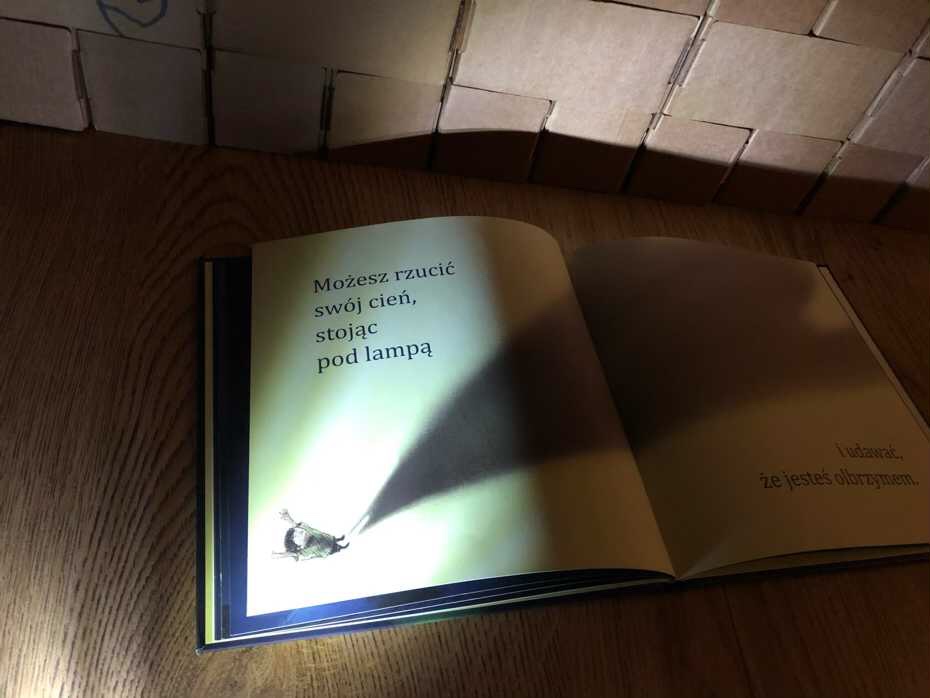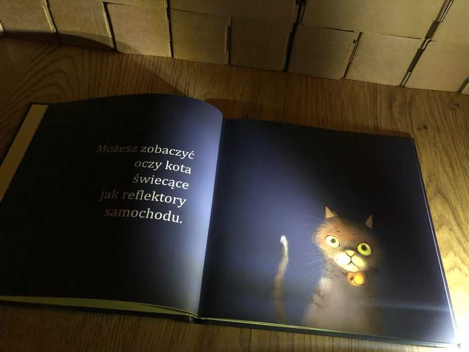 Tekstu w środku nie ma za dużo – jest tak naprawdę kilka zdań, pokazujących co możemy robić w ciemności. Czcionka jest dość wielkiego rozmiaru, co jest plusem, ponieważ dzieci mogą samodzielnie czytać tę książkę.