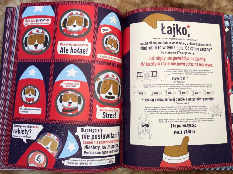„Łajka kosmiczny pies” to ważna i intrygująca publikacja, pokazująca czym są przyjaźń i odpowiedzialność. Ponadto porusza temat złego traktowania zwierząt i wykorzystywania ich w eksperymentach. Myślę, że spełni się w odbiorze dla nieco starszych dzieci, obowiązkowo dla miłośników pięknych książek.