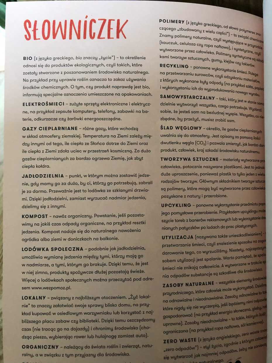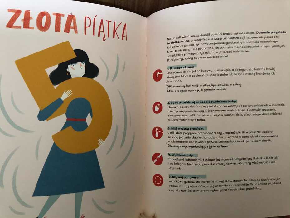 Złota Piątka, znajdująca się tuż przy końcu lektury, pomoże w wypracowaniu dobrych nawyków. W czołówce górują tutaj: picie wody z kranu, wymienianie się niechcianymi przedmiotami, noszenie ze sobą bawełnianej torby i własnego prowiantu w wielorazowych pojemnikach, wielokrotnego używania tych samych rzeczy w pomysłowy sposób. Natomiast zaraz po niej zamieszczony jest słowniczek najważniejszych pojęć związany z tematem książki.