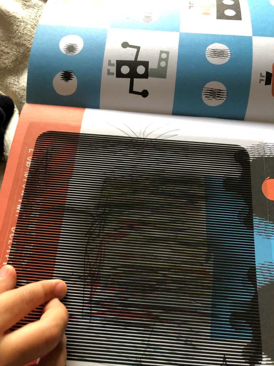Dzięki dołączonej zwykłej (choć nie do końca) foliowej karteczki w paski, można wprowadzać w ruch wszelkie trybiki i elementy robota. Wystarczy przyłożyć ją do ilustracji i bardzo powoli przesuwać od jednej krawędzi strony do drugiej. W ten sposób powstaje iluzja ruchu. Dzięki technice „ombro cinema” – bardzo starej technice animacji, opartej na iluzji optycznej, maszyny ożywają.