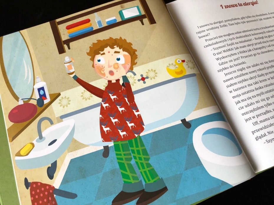 Każdy rozdział kończy się zadaniem dla malucha, np. trzeba policzyć krostki na buzi Szymka, pogilgotać czytającego książkę, pokazać jak się zjada arbuzowego loda czy wykrzyknąć „i znowu ta alergia!”
