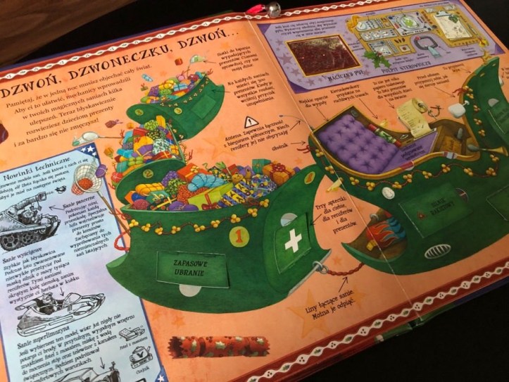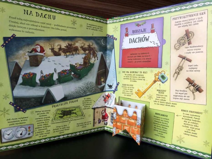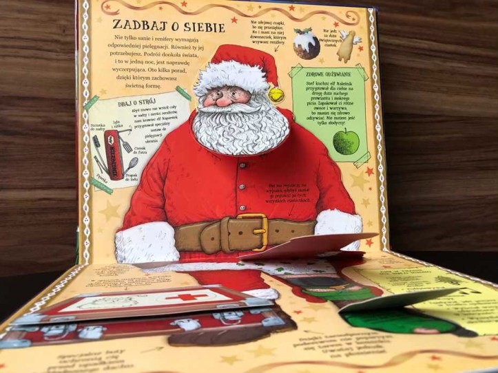Najmłodsi dowiedzą się, co powinien zrobić Święty Mikołaj, jeśli zostanie zauważony przez dziecko. Przyjrzą się wyposażeniu sań, a nawet odkryją inne modele. Nauczą się 9 imion reniferów z zaprzęgu oraz co znajduje się wewnątrz ich apteczki. Poznają praktyczne porady wchodzenia przez komin, a także ich rodzaje. Dzieci odkryją jakie elementy wchodzą w skład ubioru Świetego Mikołaja. Zapoznają się z trasą Wigilijnej Nocy oraz poczytają co nieco o prezentach.