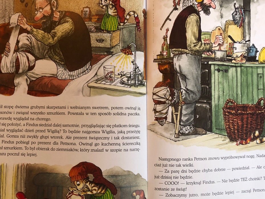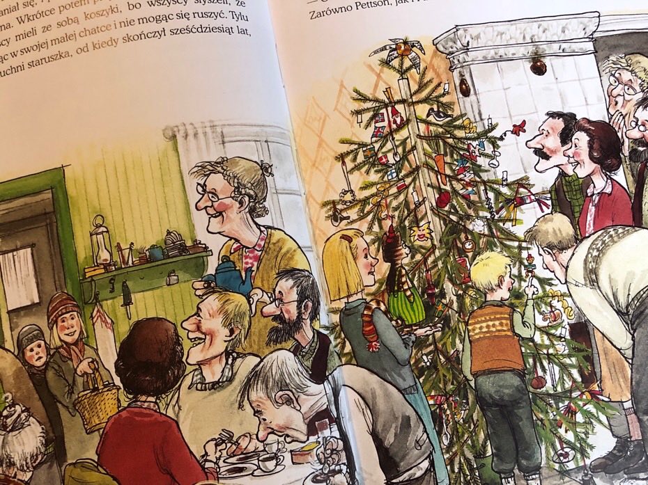 Jakiś czas później staruszek i jego kot przeżyli coś niezwykłego. Drzwi od ich domu co rusz otwierały się i pojawiali się w nich sąsiedzi zatroskani stanem nogi Pettsona. Każdy z przybywających przynosił kosz wypełnionymi świątecznymi przysmakami. Wigilijny stół nie był już pusty, ale przepełniony pysznymi potrawami od życzliwych sąsiadów.
