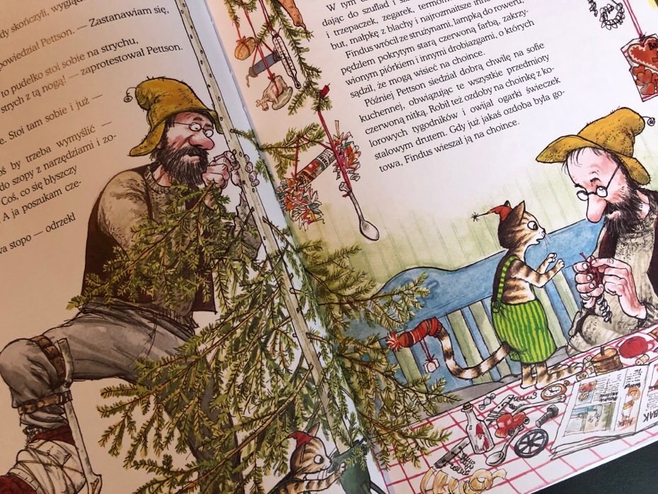 Pettson i Findus postanowili, że zrobią wyjątkową choinkę. Staruszek wyborował otwory w kijku, w który powtykał gałązki świerku. Drzewko udekorowali przedmiotami znalezionymi w domu i szopie. Wszystkie ozdoby zawiesili na czerwonych sznurkach i tym samym ozdobili choinkę.