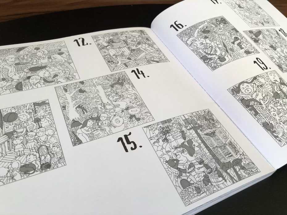 Poszukiwane elementy zostały starannie ukryte na 20 czarno-białych ilustracjach, znanych niektórym ze „Świerszczyka”.