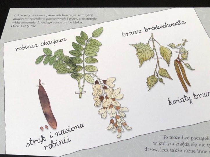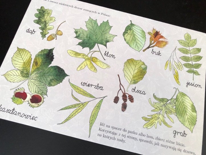Dzieci dowiedzą się z książki, dlaczego drzewa są tak potrzebne, jakie zwierzęta zakładają w nich gniazda, jakie owady możemy spotkać w korze. Będą musiały odnaleźć poszczególne ptaki i ssaki oraz odpowiadać na pytania. Zapoznają się z różnymi rodzajami liści i owocami drzew, a nawet wyhodują własną sadzonkę w domu.