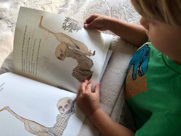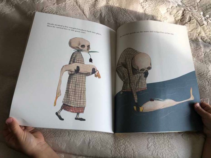 Gęś lubi rozmawiać z nową towarzyszką. Zadaje jej mnóstwo pytań. Śmierć jednak nie na wszystkie odpowiada. Między dwoma postaciami pojawia się wyjątkowa relacja. Kąpią się razem w stawie, ogrzewają w chłodne dni czy wchodzą na drzewo.