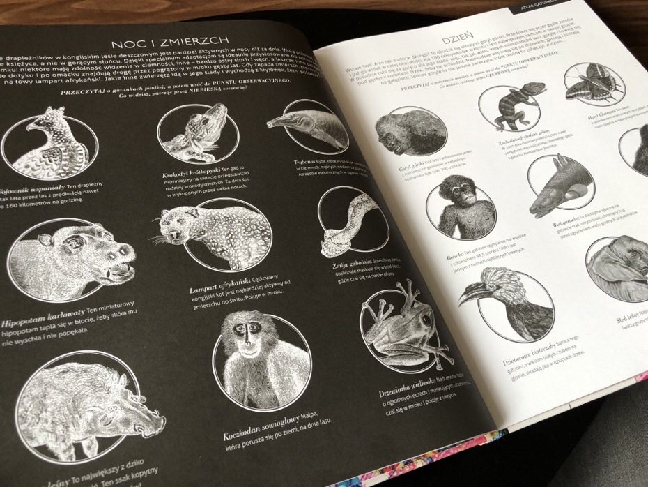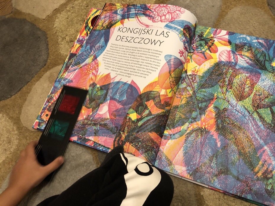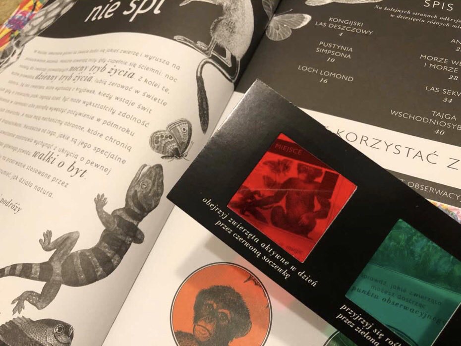 Niektóre rysunki stają się trochę mieszane i trudne do zobaczenia. Dotyczy to zwłaszcza nocnych zwierząt, ponieważ niebieska soczewka jest znacznie mniej skuteczna, niż pozostałe dwie. Być może jest to tak zrobione, dla uzyskania zamierzonego efektu, aby pokazać ich naturalne środowisko. Dodatkowym minusem według mnie jest wielkość filtrów. Przez tak małe okienko mało co widać. Na szczęście pożyczyliśmy większe soczewki z innej książki. Radość z ponownego odkrywania ukrytej treści przez Adasia była nie do ocenienia.