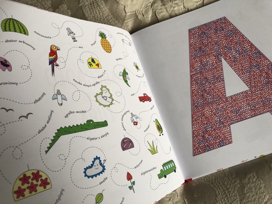 Przewracając stronę po stronie widzimy, że każda rozkładówka składa się z jednej wielkiej litry, a na sąsiadującej kartce widzimy kolorowe obrazki.