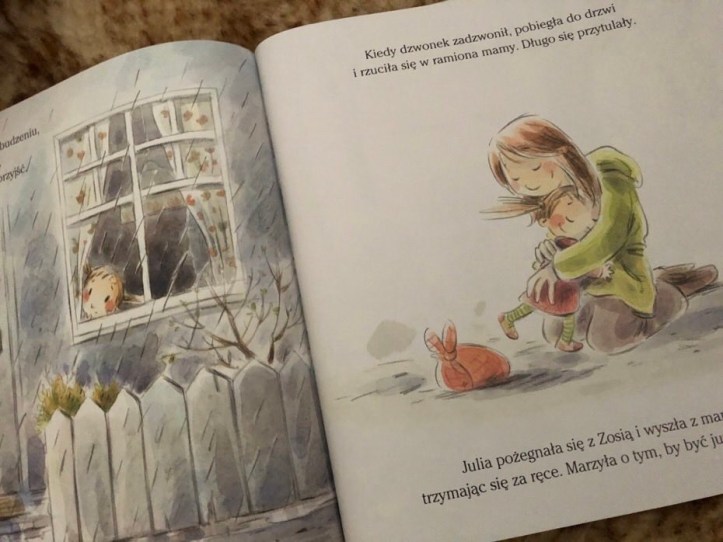 Następnego ranka Julka wyczekiwała na mamę w oknie. Wytęskniona dziewczynka, kiedy usłyszała dzwonek do drzwi, wybiegła jej na przywitanie. Wracając do domu, mama zapytała Julkę, czy może chciałaby zaprosić Zosię na sobotę i tym razem usłyszała od córeczki „Tak”.