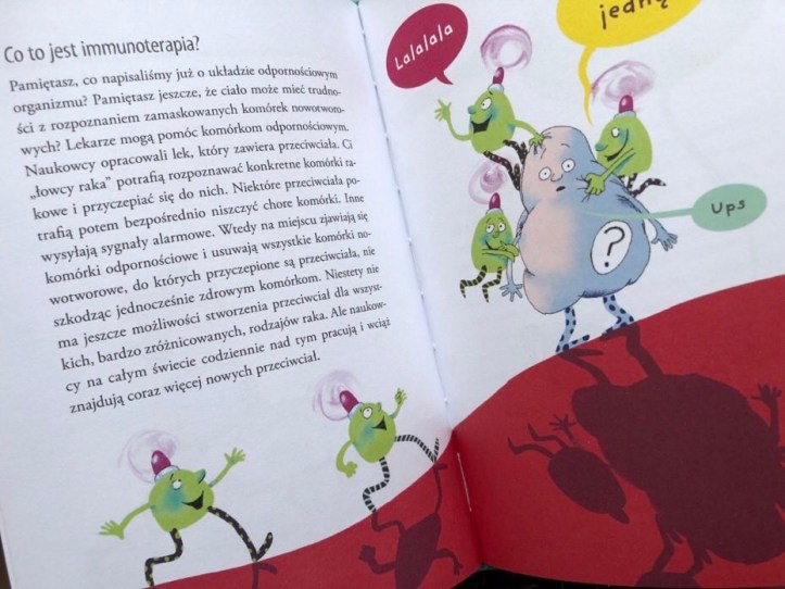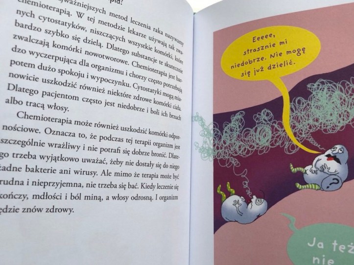„Co to ten rak?” sprawdzi się u nieco starszych dzieci. Chociaż muszę przyznać, jak na 4.5-latka, Adaś coś tam wiedział i nawet dyskutował ze mną o komórkach w ciele. Wszytko to, za sprawą kultowego serialu „Było sobie życie” i serii książek, o których pisałam tutaj. „Co to ten rak?” według mnie to „must have” – pozycja, którą każdy powinien przeczytać, zważywszy na to, że nowotwory w dzisiejszych czasach obecne są wszędzie… polecam.