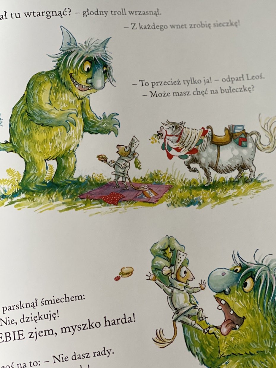 Kilka godzin później Leoś piknikuje nad górskim potokiem, gdy spod mostu wyskakuje troll i grozi, że go zje. Znów Leoś zostaje uratowany przez książkę. Tym razem jest to tytuł: „Trzy koziołki i Troll”, którego treść musiał nieco zmienić pod zaistniałą sytuację.