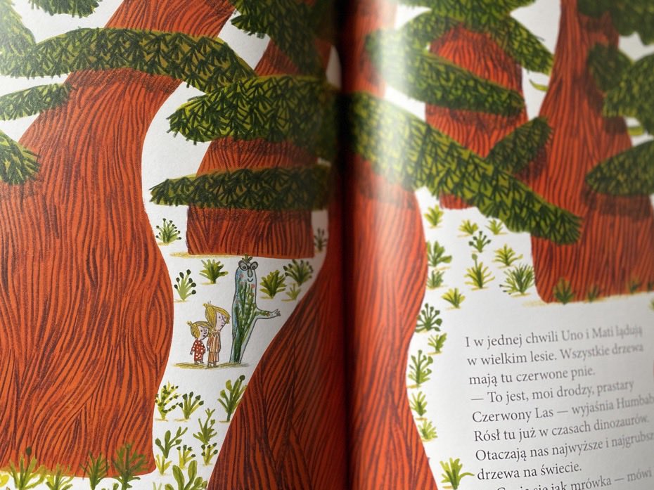Drugim pragnieniem Una i Matiego była podróż do lasu. Humbaba przenosi chłopców do prastarego Czerwonego Lasu, gdzie pośród ogromnych drzew rodzeństwo czuje się mrówki. Nagle jeden z nich odkrywa wielką, głęboką grotę. Chłopcy spostrzegają tam spore jaja, a jedno z nich zaczyna drgać. Chwilę potem pojawia się rozwścieczona dinozaurzyca. Czas uciekać, więc nie myśląc dłużej, bracia wypowiadają ostanie życzenie, aby duch zabrał ich do rodzinnego domu. Humbaba spełnia ostatnią prośbę, po czym ze spokojem odchodzi do cedrowego lasu, by strzec swoich drzew.