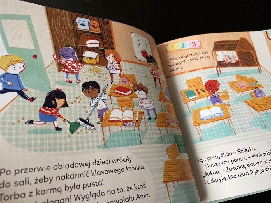 Po przerwie obiadowej dzieci wróciły do sali, żeby nakarmić klasowego królika o imieniu Śnieżka. Torba z karmą była pusta, więc Iga stwierdziła, że zostanie detektywem i odkryje, kto ukradł obiad królikowi.