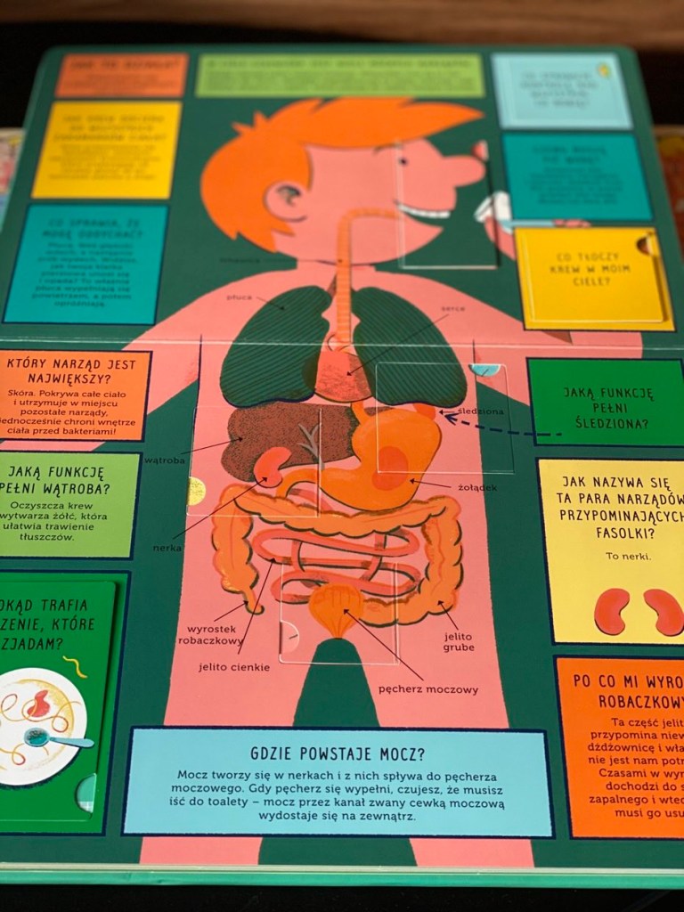 Kartonowa książka zawiera 100 pytań i odpowiedzi oraz aż 70 okienek do odkrycia. Jest to propozycja dla dociekliwych przyszłych naukowców i studentów medycyny w wieku przedszkolnym, a nawet wczesnoszkolnym, która z pewnością zaskoczy niejednego dorosłego.