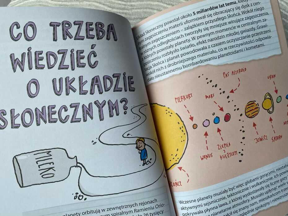 Przewracając strony, naszym oczom ukazują się tematy takie jak: różnego rodzaju urządzenia używane w astronomii, układ gwiazd czy Księżyca, Słońce i planety Układu Słonecznego. Dowiemy się paru ciekawostek o Jowiszu, meteorytach, czy planetach karłowatych. Dla mnie ciekawym faktem okazało się to, że Pluton, podobnie jak całkiem sporo innych obiektów, krąży wokół Słońca, ale mało się o nich mówi. Dalej dowiadujemy się innych faktów o Wszechświecie, Drodze Mlecznej, mgławicach, czarnych dziurach, odkrywaniu nowych planet i najciekawsze: czy istnieje życie poza ziemią…