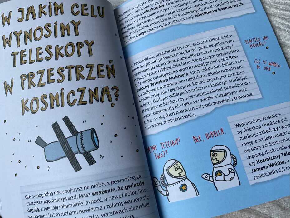 Czytając książkę, naszą uwagę przyciągają ciekawe ilustracje, zrobione w prostym, ale fajnym stylu. Mnie podoba się humor dodany do obrazków jak choćby rozmowa dwóch astronautów: Astronauta 1: “Fajny teleskop! Twój?” Astronauta 2: “Nie, Hubble’a…”