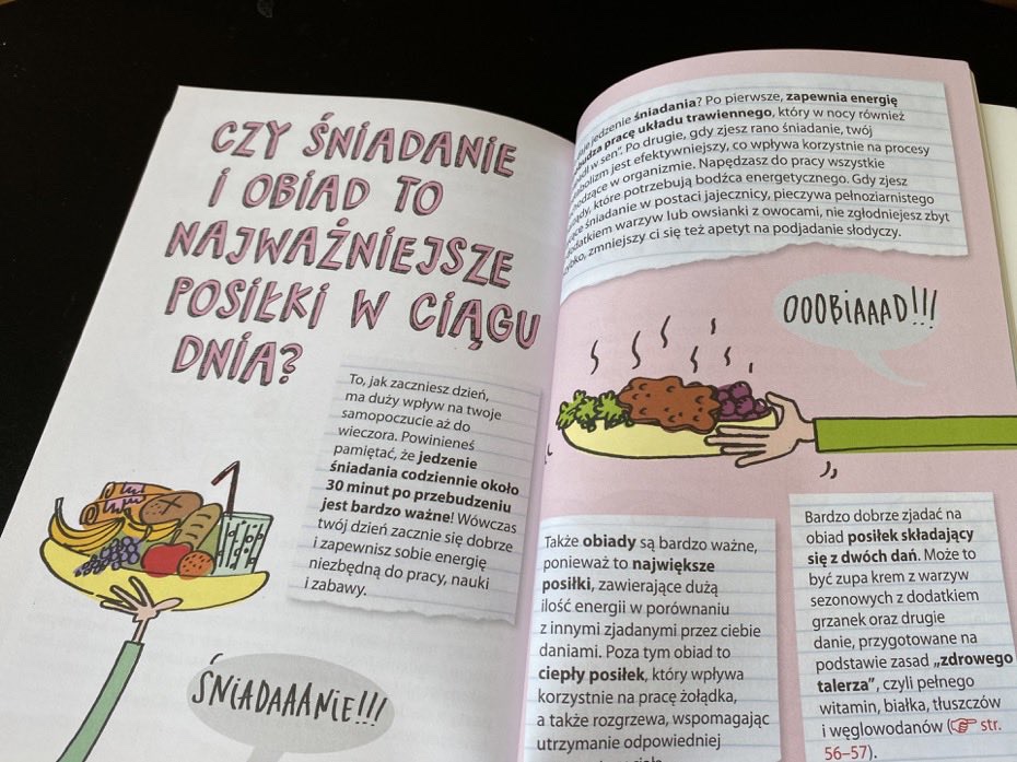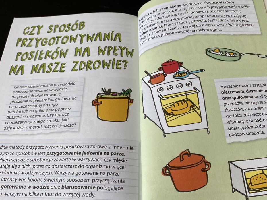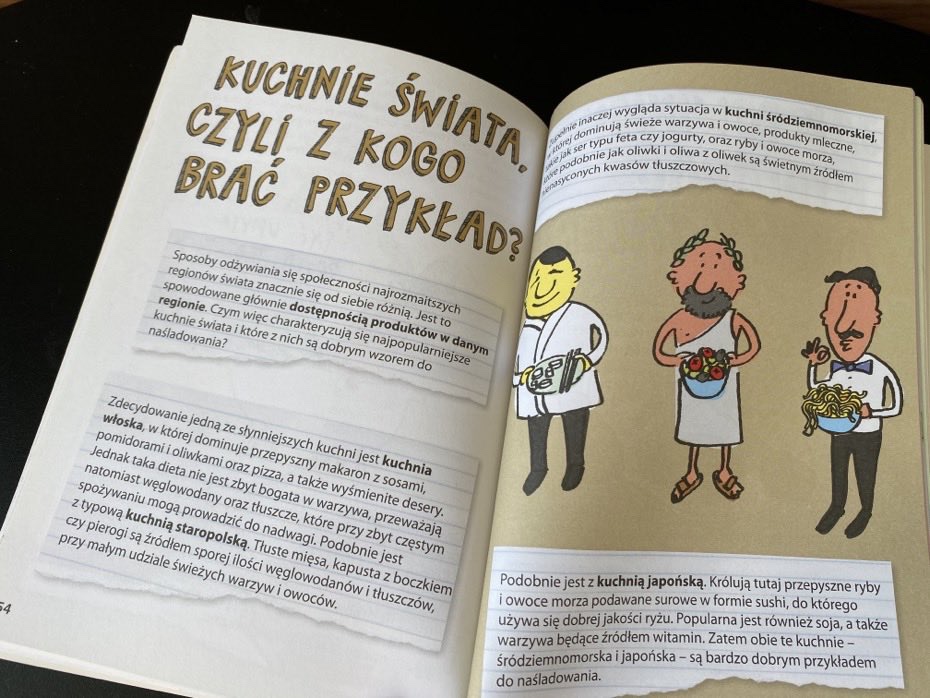 Lektura porusza tematykę różnych diet, takich jak weganizm, jedzenia różnych rodzajów mięsa, ryb i nawet cukru tzw. “białej śmierci”. Ciekawe są tematy słodyczy, które powinniśmy robić samodzielnie, czy czytania etykiet na produktach w sklepie. Mowa jest też o nadwadze, alergiach pokarmowych, chorobach takich jak cukrzyca itp. Część o myciu warzyw i owoców daje do myślenia, podobnie jest z sekcją najlepszych kuchni światowych. Ważne są tematy ilości i czasu posiłków. Bardzo zainteresował mnie temat rodzajów herbat oraz sposobu przyrządzania potraw. Okazuje się też, że jedzenie miodu i czekolady (od 70% wzwyż) jest bardzo zdrowe. Na zakończenie książka odpowiada czy można pić słodzone napoje oraz mleko jest zdrowe.