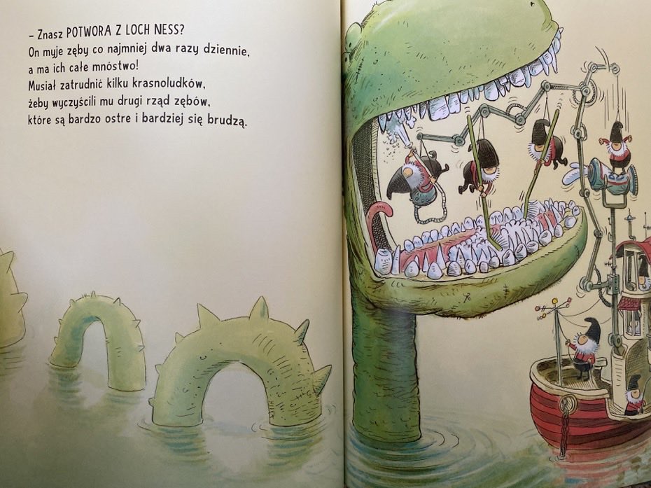 „Nawet potwory myją zęby!” to książeczka, która w zabawny i sympatyczny sposób wyjaśnia najmłodszym, jak ważne jest codzienne mycie zębów i pokazuje, jak czynność tę zmienić w fajną zabawę.