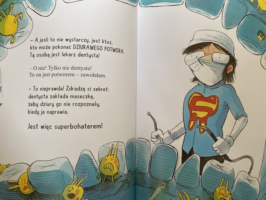 Czarny, kosmaty stworek wyjaśnia, że lekarz dentysta stoi po naszej stronie. Jest on superbohaterem, noszącym maseczkę, aby zębowe potwory go nie rozpoznały. Dziewczynka nie jest do końca przekonana i stwierdza, że mycie zębów jest nudne. Potworek podpowiada jej, jak może umilić sobie czas spędzony na szczotkowanie i podsuwa pomysły. Aby się więcej nie nudziła, może myć zęby pod prysznicem, albo stojąc na jednej nodze, czy też robić śmieszne miny, a najlepiej, kiedy mogłaby zmienić się w potwora przeciwko dziurom!