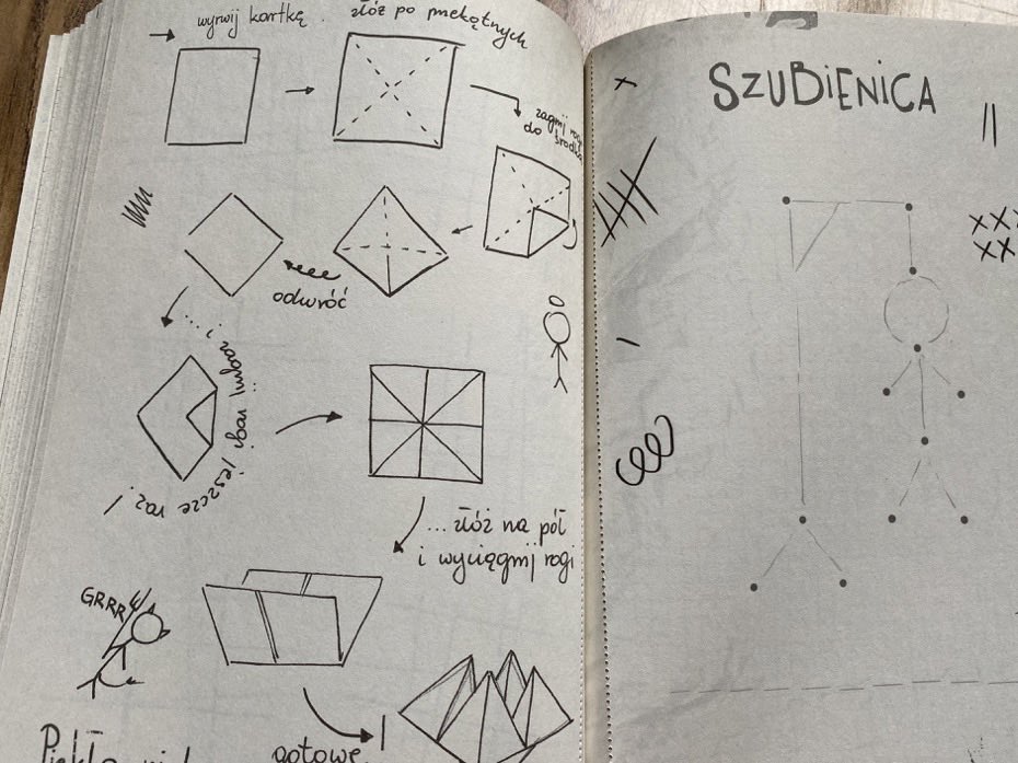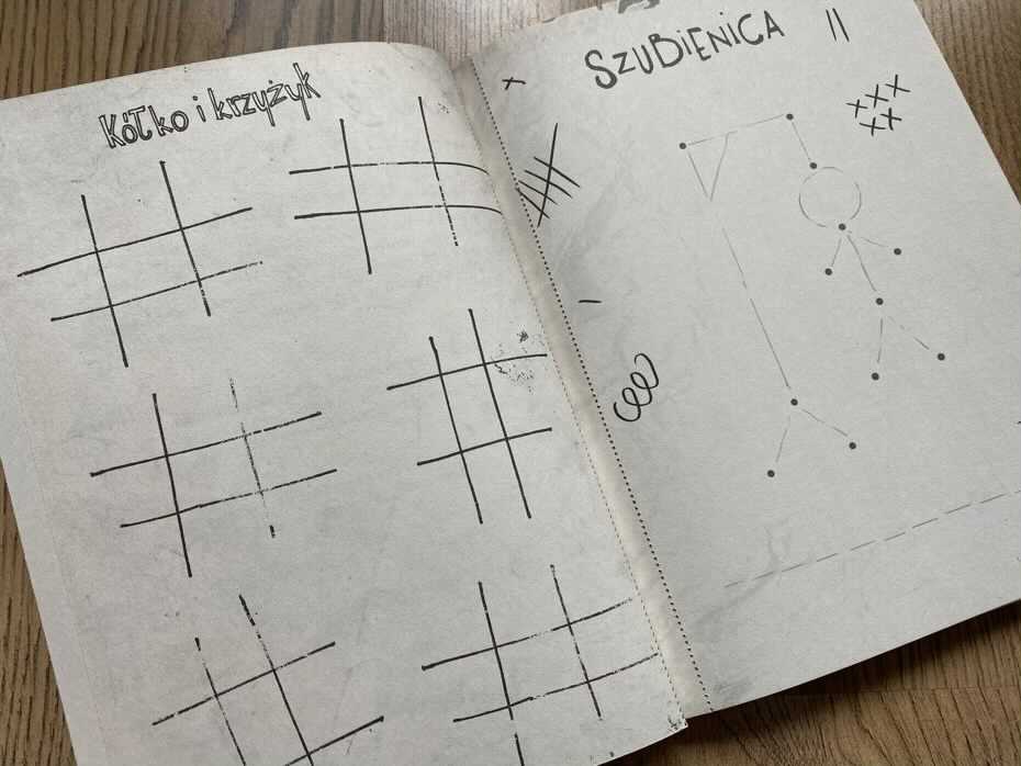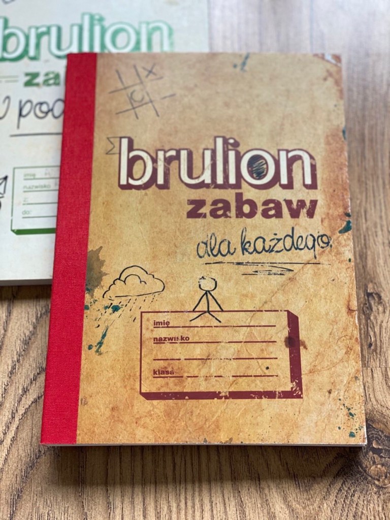 Brulion zawiera gotowe szablony do wyrwania. W środku znajdziemy gry w statki, państwa, miasta, kropki, kółko i krzyżyk, szewca, boisko, czy wisielca. A także podpowiedzi, jak złożyć samolot z kartki, albo piekło niebo.